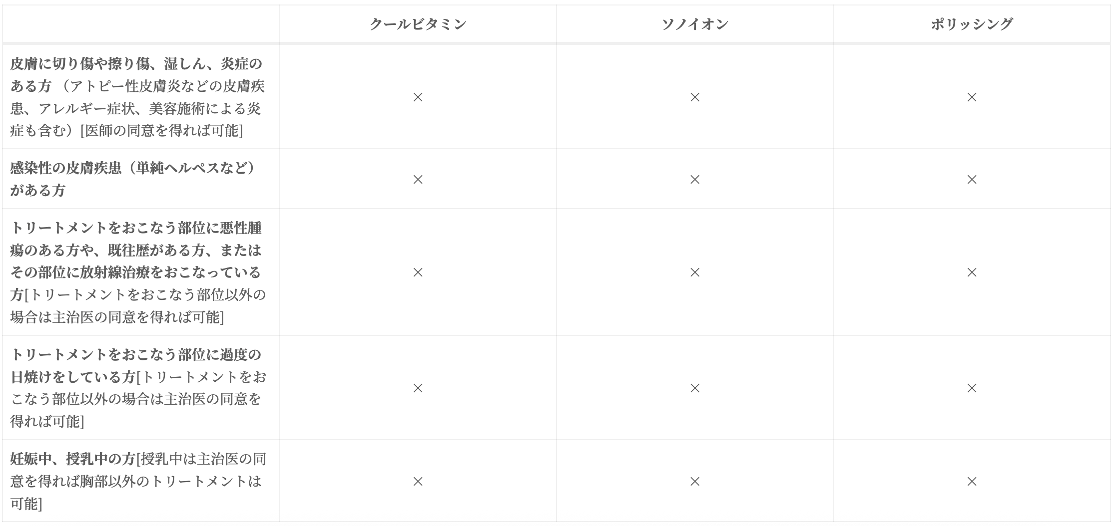 | トリートメントをおこなう部位に過度の日焼けをしている方[トリートメントをおこなう部位以外の場合は主治医の同意を得れば可能] | × | × | × |